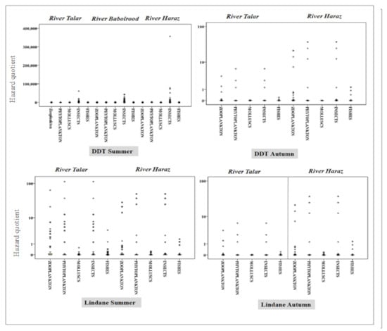Ecotoxicological risk for flora and fauna was estimated using the hazard quotient (HQ) approach, as mentioned elsewhere []. It was observed that the lower trophic levels in all rivers were generally affected by lindane and DDT. Overall, the risk indicated in summer was considerably higher for both DDT and lindane in all rivers. The risk due to DDT was observed in various trophic levels; however, the risk was observed in one species each in phytoplankton, zooplankton and mollusk groups by lindane in summer.