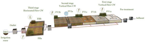 The raw wastewater is diverted to a settler tank with bar racks. The pretreated wastewater is then directed to the first storage tank and pumped into the first VFCW stage (3 beds). From the first VFCW stage (total: 72 m2; each bed is 24 m2), the outlet water flows to the second storage tank and is then pumped to the second VFCW stage (total: 48 m2; each bed is 24 m2). The treated water then flows via gravity towards the third HFCW stage (total: 72 m2; each bed is 36 m2). Finally, the treated water from the HFCWs is diverted into a reservoir tank for further water reuse. The first VFCW filters have 3 layers: a filtering layer (70–85 cm high) of different materials, a transition layer (10 cm) of 8–16 mm gravel, and a drainage layer (25 cm) of 25–40 mm gravel. The second VFCWs filters have 3 layers: a filtering layer (70–90 cm high) of washed river sand, a transition layer (10 cm) of 5–15 mm gravel, and a drainage layer (25 cm) of 25–40 mm gravel. Finally, the third stage of HFCW filters provides a filtration zone with 5–15 mm gravel and a zone for the distribution and drainage area with 40–80 mm gravel. The main design parameters of the hybrid pilot plant are shown in Table 1.