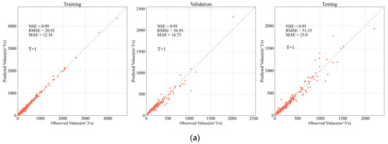 Figure 8 and Figure 9 is the scatter graph and the hydrograph of the best model considering the overall performance in the validation set and testing set for one-day-ahead forecasting and two-day-ahead forecasting. The NSE values in the validation set and the testing set all exceed 0.95, indicating that the model can provide runoff prediction with high precision. The results also suggest that though the forecasting accuracy declines significantly with the increasing lead time, the NSE values are still over 0.83, acceptable, and meaningful for practical use. Furthermore, the scatter plots and the hydrographs show that the apparent deviations are more likely to occur as the flowrate increases. This pattern is more evident in the T + 2 forecasting, in other words, in the forecasting with a longer lead time. From the aspect of the hydrological mechanism, the large flowrates in this research area are usually caused by intensive rainfall processes, in which the infiltration excess (Horton) runoff’s occupancy increases [63]. Since the Horton runoff process driven by intensive rainfalls has a relatively short duration [64], although the runoff data at the distant stations can partially explain the flowrate at the prediction target, it is still difficult for the models to accurately predict the large flowrate two days later. The performance comparison between T + 1 and T + 2 forecastings also shows that the rainfall and runoff data one day before the prediction date is valuable. This can be explained by the fact that in some rainfall-runoff events, the data’s time lags caused by the distance between the prediction target and some adjacent upstream stations are less than two days. Additionally, the deviations when dealing with large flowrates may also be caused by a fact that the weighting matrix does not take the seasonal variation of the rainfall-runoff mechanism [65] into account.