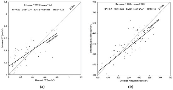 The mean hourly estimated ET for dryland was 0.33 mm h−1, and the mean observed ET was 0.28 mm h−1. For the irrigated model, the mean simulated value was 0.47 mm h−1, and the mean observed value was 0.43 mm h−1.