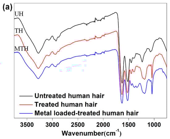 FT-IR spectra of human hair. UH: untreated human hair, TH: treated human hair, MTH: metal loaded-treated human hair. (a) Full-scan spectra, and (b) spectra in the range from 850 to 1750 cm−1.
