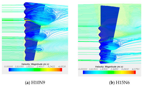 Streamlines near the surface of (a) H15N6 and (b) H15N3 when attack angle is 16°.