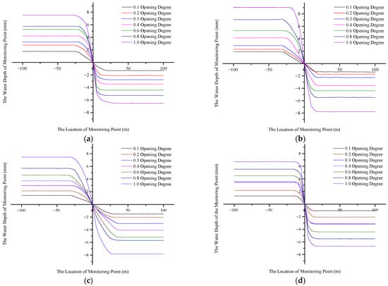 To explore the area where the water surface is stable and use this area as the location of the water-level monitoring point, we applied the Fluent 18.0 software to derive the abscissa and ordinate of the water–air interface of the longitudinal section of the trunk channel and the branch channel and draw the relationship between the position of the monitoring point and the fluctuation of the water-surface line, as shown in Figure 7. To describe the change law of the water surface more intuitively, the water depth at the sluice was taken as the zero point. The slope of the curve indicates the trend of water depth changes, and the water surface is in a stable state when the curve is horizontal. The inflection point of the curve was used as the criterion for evaluating the stability of the liquid level and as the location for measuring the depth of the channel.