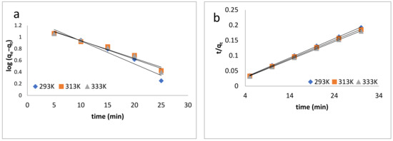 In this equation, k1 (min−1) is the equilibrium rate constant, qe and qt are the amounts of dye adsorbed at equilibrium and t is time. The values of the constants k1 and qe were determined from the slope and intercept of the log (qe − qt) versus t [79] plot, which is shown in Figure 6a (Table 2).