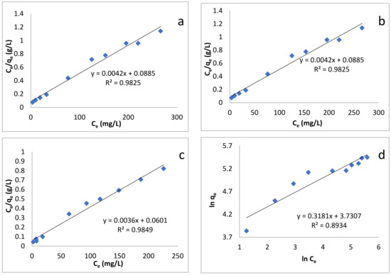 A plot of lnqe versus Ce enables us to determine the values of the above parameters from the slope and intercept (Figure 7d–f), the values of which are given in Table 4. The values of 1/n were: 0.3181, 0.3139 and 0.3379 at 293, 313 and 333 K, respectively, which indicates that the adsorption process was energetically favorable.