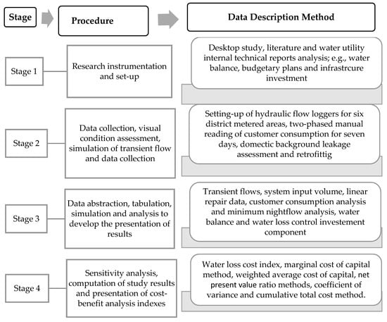 Additionally, relevant information was collected, which included the yearly International Water Association (IWA) water balance, costs related to water loss reduction, the total cost of production, water tariffs, the activity procedure for active leakage control, and different domestic background leakage trends. The data from the water utilities were only available from 2015 to 2019, which was the period used for the analysis. Figure 1 presents the process flow diagram that was followed.