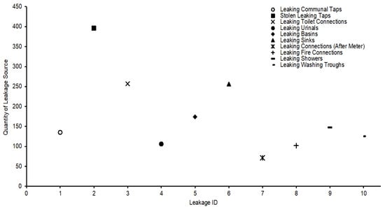 This section of the study presents the baseline data that were collected before the team could determine the total capital investment cost of retrofitting per household. Figure 2 shows the results obtained for the 110 randomly selected households inspected for domestic and background leakages (e.g., leaking taps and toilets). The results show that the 110 households produced combined leakage quantities of 1769 sources, with an average of 177 per household. From the socio-economic outlook of poverty and a lack of accountability from the residents, the results to some extent demonstrate that frequently leaking connections, toilets, sinks, and cisterns are among the highest contributors to domestic background leakage. Although the authors could not quantify the exact volumes that these leaking sources contributed to the overall NRW [,,], the authors hold the view that items such as leaking service connections from households have a minimum leakage flow rate of 32 L/hour/m, as supported by Makaya []. This means that, with the number of leaking items presented in Figure 2, vast volumes of water are lost in the background daily. Therefore, it can be concluded that capital investment into the retrofitting, replacement, and repair of leaking and broken items such as taps and connections would greatly reduce MNF, NRW, and the overall SIV in Alexandra Township.
