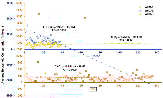 Phase 3: The results for this phase are represented by AHC3. The 38 properties comprising the sub-dataset were retrofitted to reduce domestic background leakage. After the retrofitting capital investment project, customer meters were again read manually and consumption was recorded between 15 and 21 April 2021. The findings indicated a reduction in AHC from a constant value of 426 m3/year to 302 m3/year between AHC2 and AHC3. Furthermore, although the linear reduction values (R2) for AHC1, AHC2, and AHC3 appear insignificant, a decline in AHC during the three-phase approach is clearly evident (e.g., a decline from AHC2 = 1369.4 m3 to AHC3 = 301.99 m3/year). This projected annual consumption between AHC2 and AHC3 was 16.11% less than the 360 m3/year recommended threshold by Wegelin []), who outlined that consumption over 360 m3/year/household should be classified as commercial and unauthorized consumption. Therefore, the authors hold the opinion that implementation of the “social capital investment intervention strategy” (SCIIS) positively contributed to the overall reductions in NRW, MNF, and SIV in the water distribution system. The SCIIS unit cost per household was used to perform the sensitivity analysis during the cost–benefit analysis (CBA) indexes in the later sections of this study.
