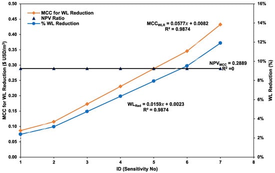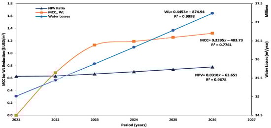 Other studies concluded that a lower MCC-versus-NPV ratio results in the non-achievement of the economic level of water leakage (ELWL) in capital water reduction [,,,,,]. The ELWL is the breakeven point, wherein the MCC graph intersects with the NPV and measures the allowable level of leakage per capital cost investment into a specific water loss reduction strategy []. The results show that linear reduction values (R2) of 0.7761 and 0.9998 for the MCC and water losses (WL), respectively, yield a constant ratio of 0.553 for MCC:WL, which means at least 55.3% of WL reduction capital investment is lost through leakage. Finally, the results may be interpreted as a prediction that, from the year 2026 and beyond, unless other WL reduction interventions are implemented, the cost of WL will continue to rise, whereas the MCC and NPV will remain low, thus making it impossible to achieve the ELWL.