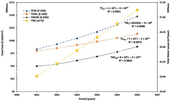 Figure 5 shows the integration of the total cost method in which non-revenue water (NRW) was compared with the total cost of water (TCW). The total cost of water losses (TCWL) were based on TLFR or TAVL (Equations (3)–(5) and Table 5). Furthermore, the total water loss reduction cost (TWLRC) was inclusive of the investment cost into CAPEX and O&M as water loss reduction strategies. The results for the year 2021 demonstrated that TCW and TWL increased with a similar trajectory, which was demonstrated by the almost equal linear values (R2) of 0.9931 and 0.9998, respectively. The projected results of TCW and TWL demonstrate that by 2026 almost 100% of the SIV will be regarded as NRW in the case study area, since the two water loss reduction strategies (CAPEX and O&M) are the only current options that the utility is presently investing in due to financial limitations. Financial limitations make it difficult for the water utility to curb water losses []. The financial limitations of water utilities are a common finding in some parts of the world [,,,,,,,,,,,,]. The results indicate that in mid-2022 and 2025, the TWL graph intersected the TWLRC and TCWL graphs in an upward trajectory, which suggests that the cost of WL surpassed both the marginal production investment cost and the WL reduction capital investment. The results demonstrate that although WL reduction investments (CAPEX and O&M) are currently being implemented, they both yield minimum returns on investment (ROIs) for the water utility, since they are unlikely to achieve the ELWL. Therefore, the authors recommend that in order to achieve the ELWL, more WL reduction strategies should be developed by the water utility in Alexandra Township beyond CAPEX and O&M.