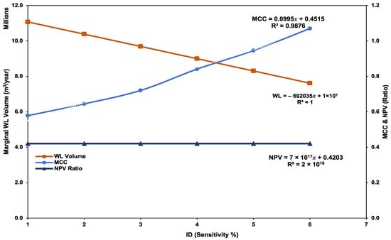 These two immediate outcomes projected a highly improbable and unattainable ELWL for the water utility. The total cost of water as a component of SIV versus total water losses as a component of NRW exhibited an upward trajectory, with R2 values of 0.99 and 1.00, respectively, and thus clearly indicated that by 2026, there is a likelihood that 100% of SIV will be recorded as NRW, which is exacerbated by various water leakage sources and a high MNF between 00:00 AM and 4:00 AM. The sensitivity analysis trajectory results showed that a reduction in TLFR to the ELWL is unlikely, because the MCC graph was moving away from the NPV ratio. The sensitivity analysis results for the SCIIS showed that 4000 properties at a unit cost of USD 5735 and water savings of 521 m3/year would achieve an ROI and ELWL on the MCC graph.
