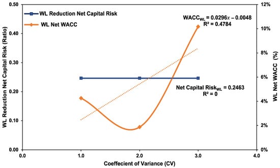 Figure 8 shows the WACC and the net capital risk for the socio-technical water loss control strategies derived from Table 7b. Figure 8 demonstrates where the ELWL was achieved, where the WACC intersects with the net capital risk graph. The net capital risk is an adjusted risk that is calculated by dividing the company’s total adjusted capital by the company’s risk weighed assets [,]. In this study, the weighted risk per water loss investment strategy was combined to make the overall WACC for the water loss capital investment, whereas the capital net risk per water loss strategy was regarded as a component of the NPV ratio. The idea of combining WACC per investment strategy and using capital net risk per strategy was inspired by the literature [,,,].