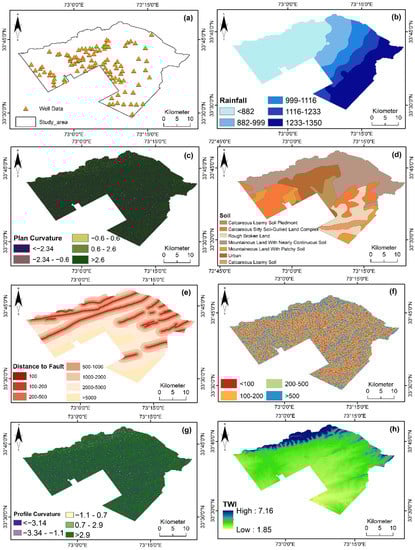 Thematic layers of selected factors for Islamabad’s data (part 1), (a) well data, (b) rainfall data, (c) plan curvature, (d) soil data, (e) distance to fault, (f) drainage distance, (g) profile curvature, (h) TWI, (i) slope, (j) elevation, (k) slope length, (l) lithology, (m) land use, (n) fault density, (o) drainage density, (p) aspect.