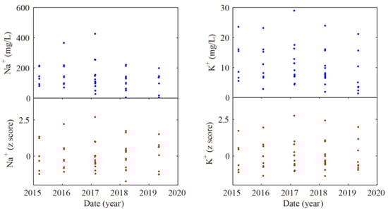 Time trend (dates indicated as yyyy) of the absolute values (in mg/L) and of the z scores of the variables Na+, K+, Ca2+, Mg2+, F−, Cl−, NO3−, CO32−, SO42−, and HCO3− from 2015–2019.