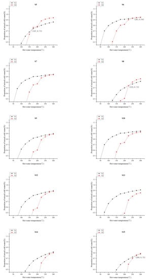 According to the Na-K-Mg triangle diagram, the hot spring water in the study area was mixed with shallow cold water in the upwelling process. There were 18 hot spring sites that were involved in the calculation (except S11 and S20) for lacking silicon values. The silicon–enthalpy equation method was used to calculate the mixing ratio of hot and cold water. Assuming that the ratio of mixing cold water was denoted as X, the relationship between initial enthalpy and initial content of silica of underground hot water, as well as final enthalpy and concentration of silica of spring water, is [49], ScX1 + Sh(1−X1) = Ss, SiO2cX2 + SiO2h(1−X2) = SiO2s, where Sh is the initial enthalpy of hot water, Sc is the enthalpy of near-surface cold water, and the average temperature of 21 °C in Southeast Yunnan is adopted in this paper [50]. SiO2h is considered the initial concentration of SiO2 in deep hot water and is the concentration of SiO2 in near-surface cold water, and 11 mg/L concentration was used in this paper [50]. SiO2s is the concentration of SiO2 in hot spring water. The relationship between temperature, enthalpy of hot water, and the concentration of SiO2 [49] is shown in Table 3. The origin software was used to draw the curves of X1 and X2, respectively, to obtain the relationship diagram of the mixing ratio of hot and cold water, in hot springs, in the study area (Figure 11). The horizontal coordinate, corresponding to the intersection point of the curves, was considered as the proportion of mixing cold water X. The coordinate corresponding to the intersection point was the initial enthalpy of deep hot water: namely, the heat storage temperature. The calculation results showed that S7, S9, S10, S12, S13, and S14 had no intersection point, which was probably because the deep hot water needed to rise to mix. There could be a loss of steam, or non-adiabatic conduction heat loss, including the mixing of hot and cold water, thereby losing heat while implementing the effects of SiO2 concentration.