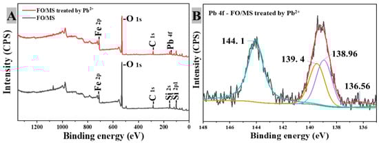 The elemental oxidation status of the materials was characterized using XPS to further examine the rules governing the formation of their microstructure before and after Pb2+ treatment [47]. Peaks of C 1s (at 285.0 eV), O 1s (at 529.5 eV), Fe 2p (at 718 eV), Si 2s (at 150.5 eV) and Si 2p (at 100.1 eV) were found, as illustrated in Figure 6A. There were peaks of Pb 4f7/2 (139 eV), Pb 4d5/2 (412 eV) and Pb 4d3/2 (434 eV) in the survey spectra of FO/MS treated with Pb2+. These findings demonstrated that Pb2+ had been adsorbed onto the FO/MS surface. As seen in Figure 6B, the Pb 4f spectrum of FO/MS subjected to Pb2+ treatment was separated into three peaks with respective binding energies of 136.56 eV, 138.96 eV and 143.77 eV. The -Si-OH and Fe-OH groups especially reacted with Pb2+, which meant that the production of -Pb-OH was attributed to peaks at 138.96 and 143.77 eV.