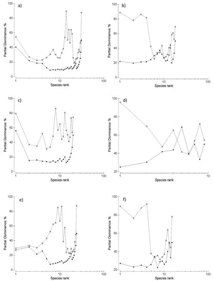 When one of the two curves is over-dependent on the single most dominant taxon, the visual information of the ABC model is challenging to interpret and may be easily misleading []. To overcome this issue, partial dominance based on the dominance of the second-ranked taxon over the remainder is recommended. Partial dominance plots ameliorate the way standard dominance curves tend to be dictated by the most abundant taxon []. ABC models based on partial dominance postulate that, with frank disturbance, dominance patterns are unaffected by successive removal of the one or two most dominant taxa in terms of abundance or biomass []. The paradigms of ABC models based on partial dominance are the same as for ABC models based on cumulative dominance: the biomass curve typically lies above the abundance curve throughout its full length in undisturbed conditions, whereas, under intermediate disturbance, there is still a change in position of partial dominance curves, with the biomass curve now below the abundance curve in one or more places, and the abundance curve becoming much more variable or “atypically erratic” []. This implies that the disturbance pervades the complete suite of taxa in the community and is not just seen in changes in a few dominant taxa []. Finally, the biomass curve might lie below the abundance curve throughout its full length under severe disturbance. Partial ABC models are less visually appealing than the original ABC models. However, they are more robust to random fluctuations in abundances of a small-sized, numerically dominant taxa [,].