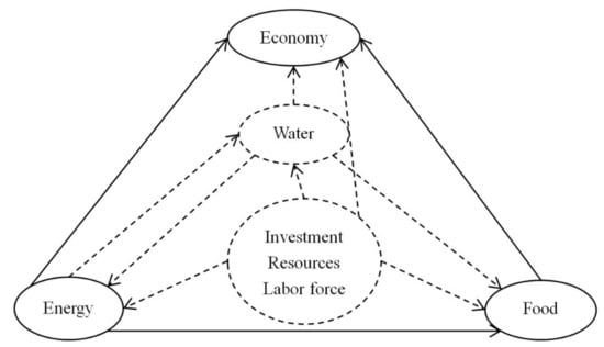 (a) Some describe the structure of the WEF system as a series structure, such as taking water resource variables as input variables to produce energy variables, then taking the produced energy variables as input variables to produce food variables, and so on to produce other variables. This one-way production structure ignores some reverse input–output relationships, such as the input of energy variables in the production process of water resource variables. Therefore, there are the problems of lacking the information to describe the internal relationship of the WEF system with the series structure.