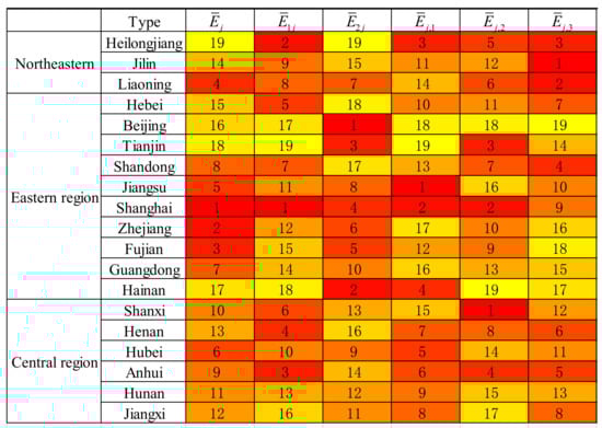 In order to better reflect the regional characteristics of efficiency, we put the provinces belonging to Northeast China, Eastern China, and Central China together. According to the efficiency value ranking, the efficiency value ranking is expressed in a gradual color from yellow to red. The redder the color of the color block, the higher the efficiency level ranking. The yellower the color of the color block, the lower the efficiency level ranking. The results are shown in Figure 2.