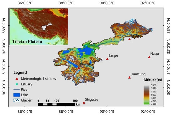 Statistics show that the total lake area on the TP is 45,000 km2, accounting for approximately 50% of the total lake area in China []. At present, the accelerating global warming trend has significantly affected the hydrological cycle of the plateau, and evolution of the runoff pattern in the alpine region has become indisputable [,,]. In particular, glaciers and snow-covered areas are highly sensitive to climate change [,]. Changes of the flow regime caused by glacial retreat and snowmelt will have a negative impact on the river ecosystem [], and rising water levels in some plateau lakes increase the risk of outburst floods []. Due to the lack of human activities, changes in lake hydrological factors (such as precipitation, evaporation, glacial melting, and permafrost degradation) in alpine regions are closely related to climate change []. In particular, for the closed lake basin, the precipitation in the surrounding high-altitude area and the melting of alpine glaciers form an effective supply to the lake, and the continuous increase in water storage results in continuous expansion of the lake area. Although there are some controversies in the dynamic change and attribution of plateau lakes, many studies have shown that the accelerated melting of glaciers and snow cover and increased regional precipitation caused by climate warming are the main factors affecting the changes in lake area [,,]. Therefore, how to accurately assess the water storage capacity of lakes in alpine regions and explore the mechanisms driving lake changes is one of the key issues in current water science.