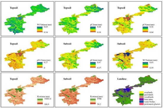 Spatial distribution of land use types and physical parameters in different soil layers.