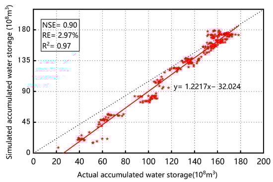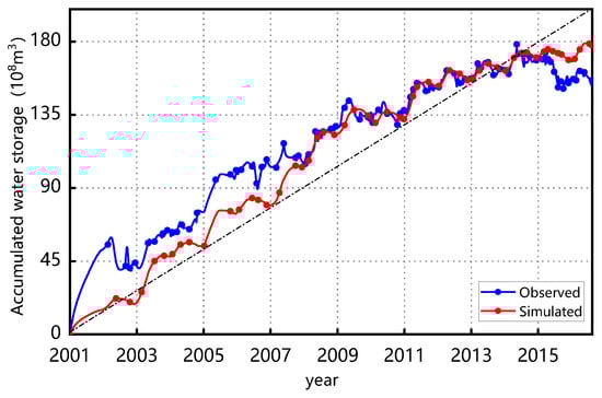 As can be seen from Table 3, the NSE, RE, and R2 for the calibration period were 0.59, 17.6%, and 0.92, respectively, and those for the validation period were 0.61, −2.0%, and 0.81, respectively. The NSE and RE values for the validation period were better than those for the calibration period, which may be because satellite technology advancement has improved the accuracy of observations of lake water level and lake area during the validation period, which in turn affects values for changes in lake water storage capacity. Figure 3 also shows that the lake water storage capacity in the dataset exhibited irregular oscillatory variation within the calibration period; the magnitude of variation was relatively high in the short term (2002 and 2006) and displayed relatively regular fluctuation after 2009. The RE reached 17.6% during the calibration period, which indicated that the simulated lake inflow was relatively low during the calibration period, and during the validation period, R2 exceeded 0.8 and was relatively high. The comparison between the simulated and actual cumulative water storage capacity in the lake during the entire time period in Figure 4 shows that the lake inflow simulated by the model was relatively consistent with the actual values, and the model’s efficiency is acceptable.