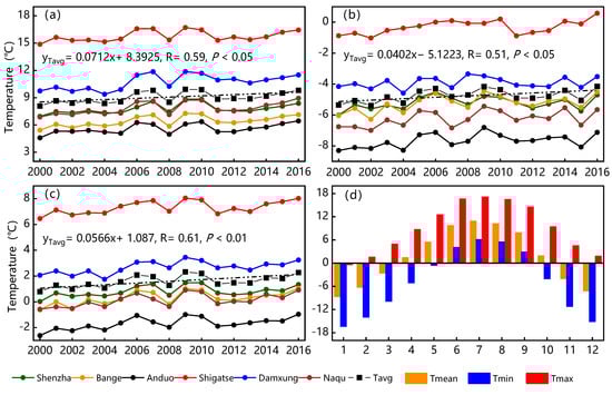 Temperature variation of meteorological stations in Siling Co. (a) Annual maximum temperature; (b) Annual minimum temperature; (c) Annual average temperature; (d) Monthly average temperature.