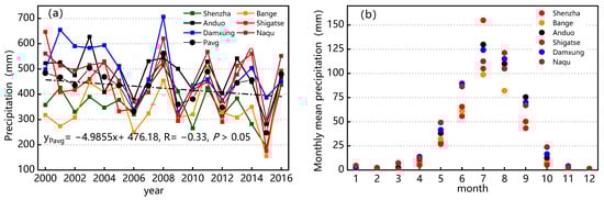 Precipitation variation of meteorological stations in Siling Co. (a) Annual precipitation; (b) Monthly precipitation.