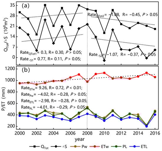 The interannual variation of the (a) total lake inflow (QTot), lake water storage capacity (ΔS) and (b) precipitation (PL or PW), evaporation (ETL or ETW) during the simulated period.