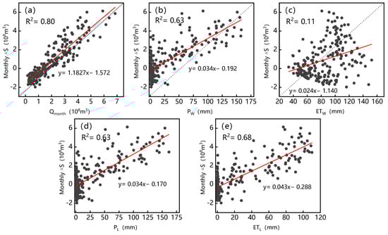 The water balance showed that lake surface precipitation/evaporation and lake inflow were the main factors affecting changes in lake water storage capacity. The diagram showing correlations of ΔS with Q, P, and ET was plotted based on the monthly data (Figure 8). Lake inflow, P, and EL were most strongly correlated with ΔS (R2 values were 0.80, 0.63, and 0.68, respectively), and there was no obvious correlation between Ew and ΔS, which indicated that lake inflow exerted the most significant impact on ΔS, followed by P, and the impact of EW was not significant. Analysis showed that EW has a continuous water supply, with small interannual fluctuations, and can be used as a stable indicator of output of water resources from the basin.