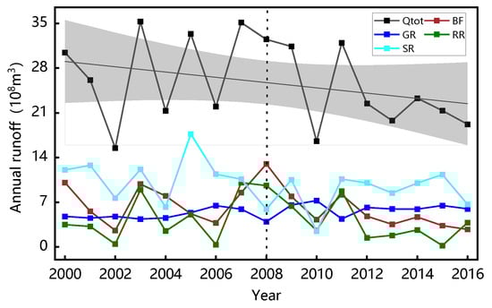 In general, the total runoff in Siling Co declined significantly between 2000 and 2016 with rates of decrease of 41 million m3/yr, and the variation trend of SR, RR, and BF is consistent with the total runoff. However, GR increased significantly at a rate of 11 million m3/yr (Figure 9). 2008 is the abrupt point of precipitation change trend through the analysis of regional precipitation characteristics. Compared with the total runoff data from 2000 to 2008, the average runoff from 2009 to 2016 declined by 471 million m3. The percentage contributions of BF and RR were significantly reduced, suggesting that reduced precipitation has a significant impact on BF and RR. Snowfall dropped along with precipitation, and the SR decreased by 187 million m3/yr before and after the precipitation abrupt change. By contrast, the contribution of glacial runoff to total runoff increased by 8.4%, which indicates that the recharge and regulation of runoff to the lake by glacial melting was more significant in the later years of the study period when precipitation was low. However, since the glacial resources are limited and can be greatly impacted by global warming, this water source regulation effect could be weakened [].
