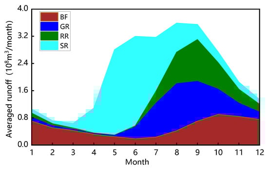 Based on the SPHY model of the Siling Co basin, the runoff into the lake was divided into the four components of GR, SR, RR, and BF. Figure 9 shows the interannual variation in each runoff component of total inflow during the simulation period. Figure 10 represents the seasonal distribution of each runoff component.