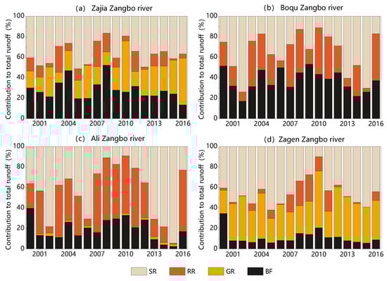 The contribution of BF, GR, RR and SR to total runoff in each sub-basin of Siling Co. (a) Zajia Zangbo, (b) Boqu Zangbo, (c) Ali Zangbo, (d) Zagen Zangbo.