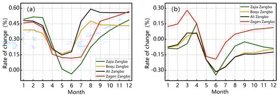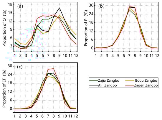 Moreover, Zajia Zangbo is the largest supply river to Siling Co, accounting for approximately 59% of the annual runoff. The contribution of the BF and SR to the runoff during the simulation period was relatively stable, with an average contribution of 65.8% (Table 4). The contribution of RR declined, while GR increased significantly (Figure 11a). The Boqu Zangbo basin has the smallest area and the lowest annual recharge. There are no glaciers in the basin and precipitation is the only water recharge source; the differences in BF, RR, and SR are small; and the BF is relatively stable. A small number of glaciers are found in the Ali Zangbo basin, the main water recharge sources for this basin were SR and RR, and their contribution to the total runoff ranged between 60% and 95%, with an average of 80%. However, the contribution of SR and RR shows considerable fluctuation. The analysis showed that the distinction between rainfall and snowfall in precipitation is subject to changes in temperature, and the SR showed a strong consistency with changes in temperature (Figure 5). For Zagen Zangbo, the dominant components of runoff were GR and SR, with an average contribution of 80.7%, while RR contributed the least, since the precipitation in this sub-basin falls to the ground mostly in the form of snow due to locally low temperatures, which are mainly caused by the high terrain and abundant glacial resources in the Zagen Zangbo basin. Figure 12a shows that the regulation and storage of glacial runoff makes the flows of ZajiaZangbo and Zagen Zangbo stabler than those of Boqu Zangbo and Ali Zangbo. The comparison shows that the pattern of runoff is similar among the four rivers; the peak occurred from May to September (Figure 12a) and accounted for 63.3% of the annual runoff into all four sub-basins.