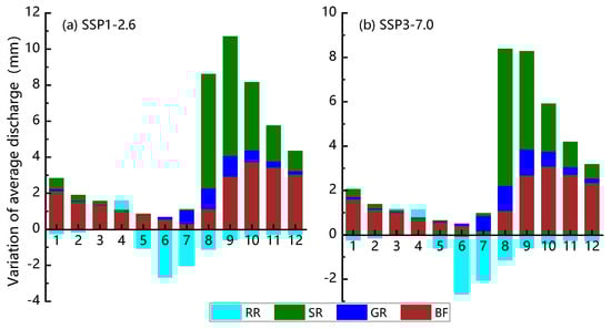 Monthly variations of RR, SR, GR and BF under the (a) SSP1-2.6, and (b) SSP3-7.0 climate scenarios.