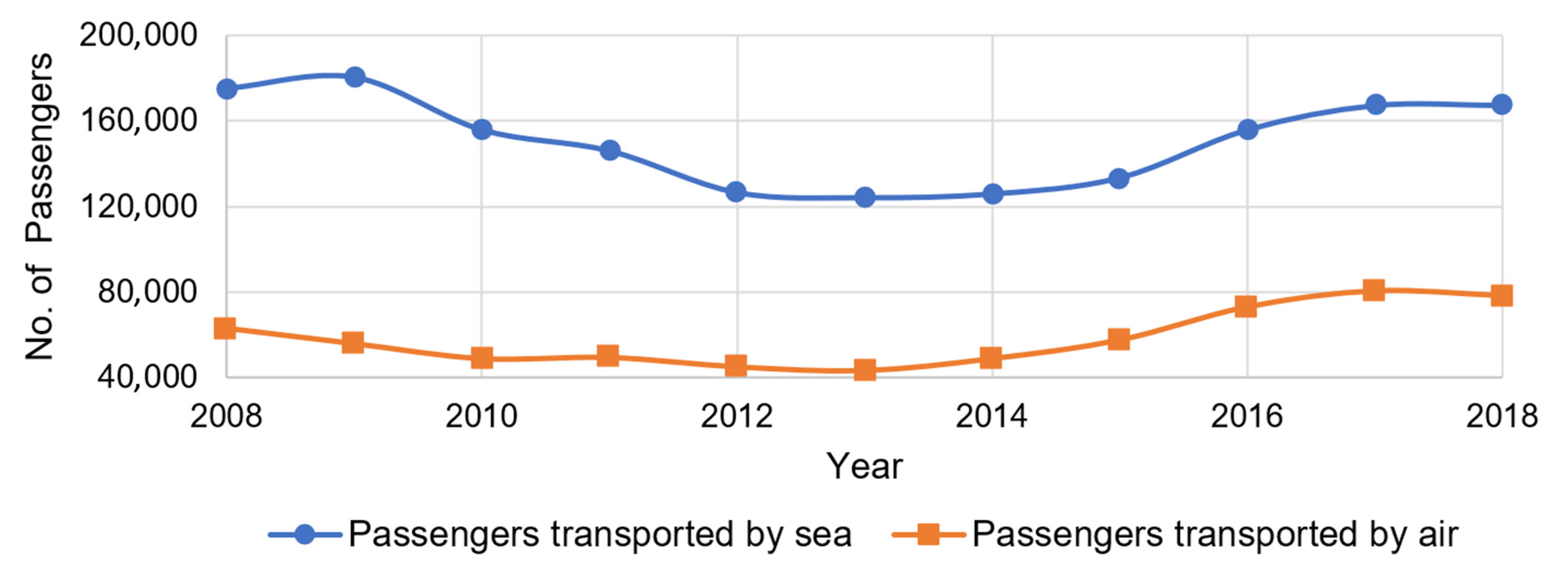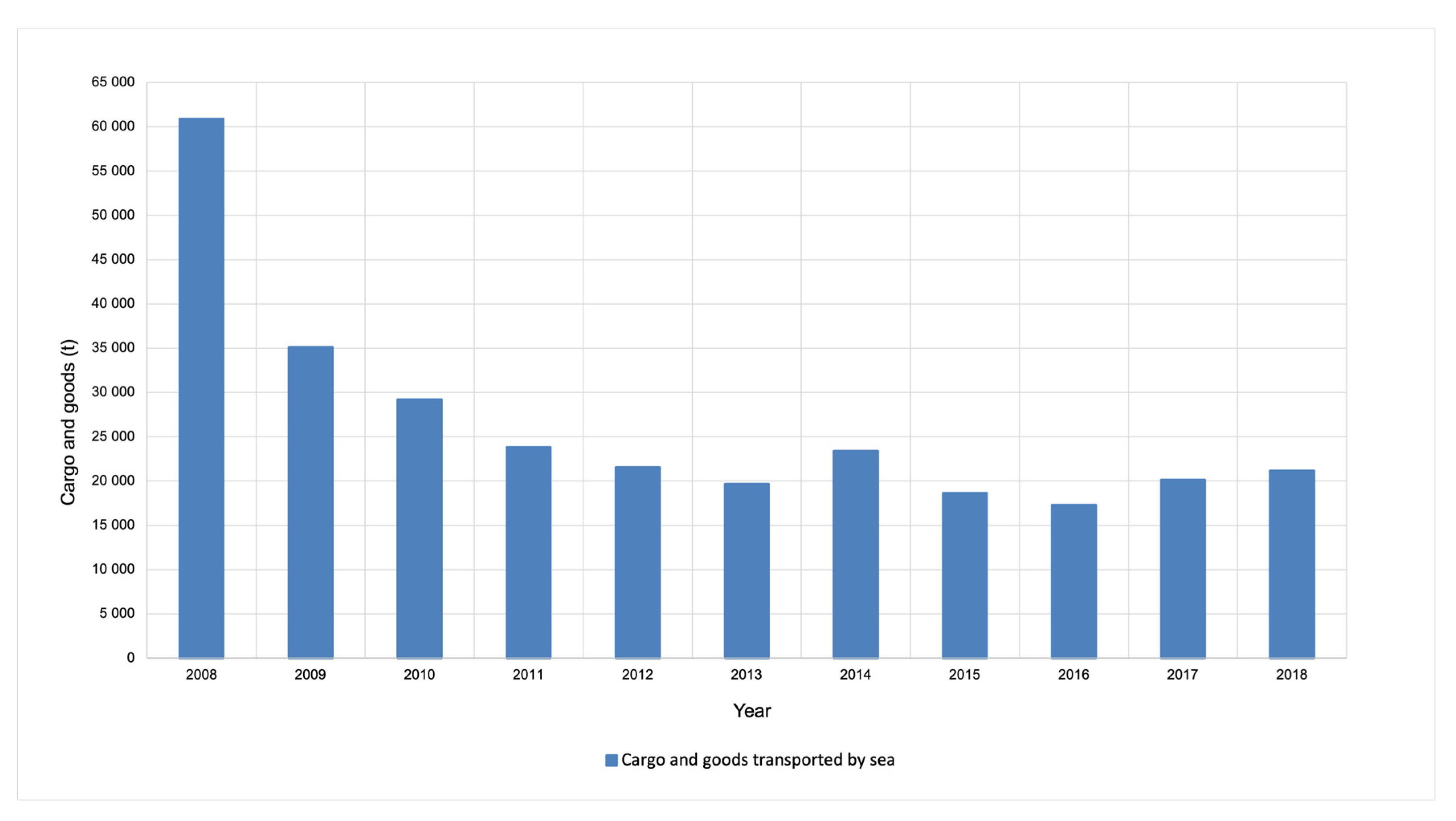 | Cargo and goods unloaded by sea (t) | 60,890 | 35,097 | 29,190 | 23,819 | 21,536 | 19,678 | 23,410 | 18,629 | 17,291 | 20,135 | 21,175 |