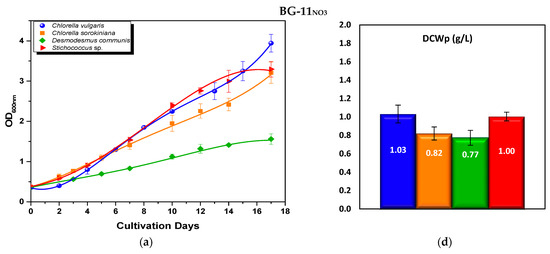 Figure 2 depicts the time profile of the optical density of the 4 species in the 3 different media, through the 17-day cultivation period together with the net biomass production measured at the last day of the cultivation period for each treatment. It is evident that all species demonstrated the highest growth rates, both in terms of OD600nm and DCWp when cultivated in BG-11NH4, where ammonium nitrogen was provided as nitrogen source. Significant differences between results were statistically proved by the ANOVA test (p < 0.05). These findings are aligned to the corresponding values of nitrogen consumption in different culture media as discussed in Section 3.2.2.