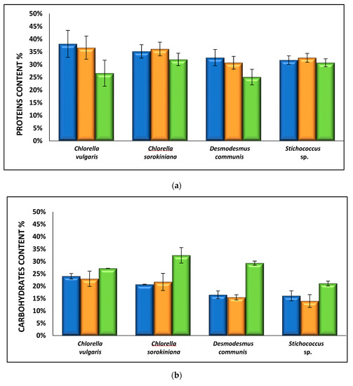 The primary target of this study is the investigation of the potential of microalgae for the treatment of an effluent with high nitrogen content; however, the examination of microalgae composition represents a challenging approach for the following biomass valorization in various applications. It is known that microalgae biomass composition is significantly affected by the cultivation conditions, nitrogen source and growth media composition [72]. The biochemical composition of the four species, cultivated in the three different media, is presented in Figure 7. The results of the present work justified that both cultivation media and nitrogen source had a considerable impact on the accumulation of the three major intracellular metabolites (proteins, carbohydrates, and lipids) of the selected species. Protein production was slightly decreased in all species when 3.7% ADE was used as cultivation medium (not statistically different), while during cultivation in BG-11 media, negligible effect was recorded by the type of the nitrogen source on the proteins content. Previous reports suggested that cultivation of microalgae in anaerobic digestion effluents resulted in lower proteins content when compared to cultivation under control media [11,55]. However, in these studies, complete consumption of all available nitrogen took place, and the reduction in the protein content in microalgae cells is occurred under N- starvation conditions [36,49]. Ιn the present study, concentration of the residual nitrogen (N-NH4) was ranged from 10.6 to 31.9 mg/L, indicating nitrogen availability until the end of the experiments.