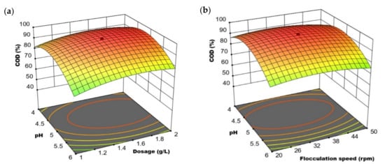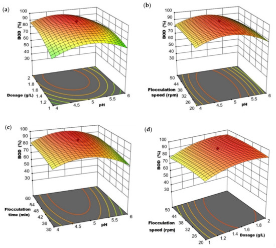 Figure 3 shows the three-dimensional surface plot on the interaction effect between pH and coagulant doses (Figure 3a), pH and slow mixing speed (Figure 3b), pH and flocculation time (Figure 3c), FeSO4·H2O doses, and slow mixing speed (Figure 3d), FeSO4·H2O doses and flocculation time (Figure 3e), and slow mixing speed and flocculation time (Figure 3f) for the BOD elimination from POME. It was perceived that the interaction effect between pH and FeSO4·H2O doses (Figure 3a), pH and flocculation time (Figure 3c), and FeSO4·H2O doses and slow mixing speed (Figure 3d) was statistically significant for the BOD elimination from POME. The interaction effect between pH and slow mixing speed (Figure 3b), coagulant doses and flocculation time (Figure 3e), and slow mixing speed and flocculation time (Figure 3f) were insignificant for the elimination of COD in POME. The percentage of BOD removed (over 90%) with increasing pH from 4 to 5 and decreased after pH 5 with increasing coagulant doses, flocculation speed, and flocculation time. Figure 3d illustrates the interaction effect between slow mixing speed and coagulant doses. It shows that the percentage of BOD elimination increased as coagulant doses and slow mixing speed increased. The highest elimination of BOD was about 92% at pH 5 and flocculation time 45 min. Similarly, the interaction effect between flocculation time and coagulant doses (Figure 3e) reveals an increase in BOD elimination in POME as the coagulant doses and flocculation time increased. Nevertheless, as the interaction between slow mixing speed and flocculation time increased (Figure 4f), it showed negligible BOD removal. Approximately 96% BOD elimination was obtained at FeSO4·H2O doses of 2 g/L, pH 5, slow mixing speed of 35 rpm, and flocculation time of 60 min.