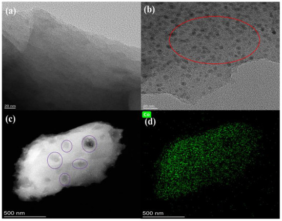 TEM diagrams of D001CB (a); and N-Co/D001CB (b); EDS layered mapping diagram of cobalt elements (c,d).