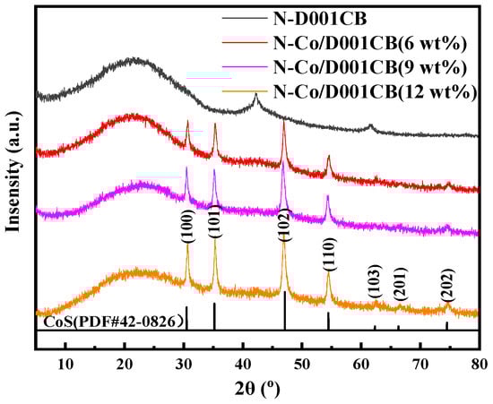 It can be seen from the XRD patterns that all carbon sphere materials have typical amorphous carbon peaks at a 2θ value of about 23° [,]. When carbonized with the used D001 resin, diffraction peaks appeared at diffraction angles of 42.9° and 62.4°, which may be the magnesium oxide formed, corresponding to the (200) and (220) crystal planes of magnesium (JCPDS: 45-0946). Comparing Figure 3 with Figure S2, whether the cobalt loading materials are calcined with DCD or not, the positions of the XRD diffraction peaks are similar, and all of them have four obvious diffraction peaks. With an increase in cobalt content, their intensity increases. It is worth noting that N-Co/D001CB both had sharper and narrower peaks, and there were three additional diffraction peaks with low intensity, but Co/D001CB did not show these peaks. After crystal form analysis, the characteristic diffraction peak positions at diffraction angles at 30.5°, 35.2°, 47.7°, 54.5°, 62.3°, 66.3°, and 74.5° correspond to the crystal planes of (100), (101), (102), (110), (103), (201), and (202), respectively, on the standard card JCPDS:48-0826 and represent the material of CoS [,]. Above all, the resin calcined with DCD can greatly improve the crystallinity of the formed CoS instead of changing the existing form on the carbon balls, which contributes to exposing more metal-active component crystal planes in the reaction system to improve its catalytic performance.