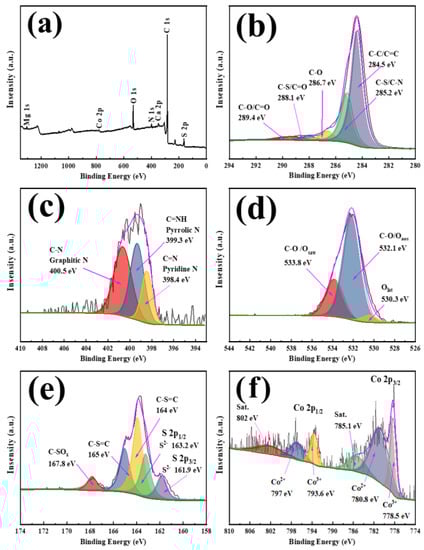 XPS diagram of the main elements of cobalt-doped carbon sphere material, full spectrum of elements (a); C 1 s (b); N 1 s (c); O 1 s (d); S 2p (e); Co 2p (f).