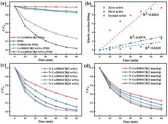 The removal of ibuprofen with different reaction systems (a); kinetic fitting curve of N-Co/D001CB + PMS reaction system (b); cobalt loading amount (c); dicyandiamide amount (d); (Temperature = 25 °C, pH = 4.5, PMS = 0.7 mM, amount of catalyst added = 0.3 g/L, IBU = 10 mg/L).
