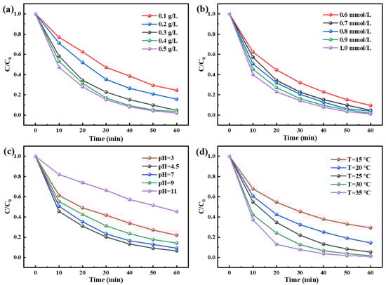 (a) The influence of catalyst (Temperature = 25 °C, pH = 4.5, PMS = 0.7 mM, IBU = 10 mg/L); (b) The influence of PMS (Temperature = 25 °C, pH = 4.5, catalyst = 0.3 g/L, IBU = 10 mg/L); (c) The influence of pH (Temperature = 25 °C, PMS = 0.7 mM, catalyst = 0.3 g/L, IBU = 10 mg/L); (d) The influence of temperature (pH = 4.5, PMS = 0.7 mM, catalyst = 0.3 g/L, IBU = 10 mg/L) on the removel of ibuprofen.
