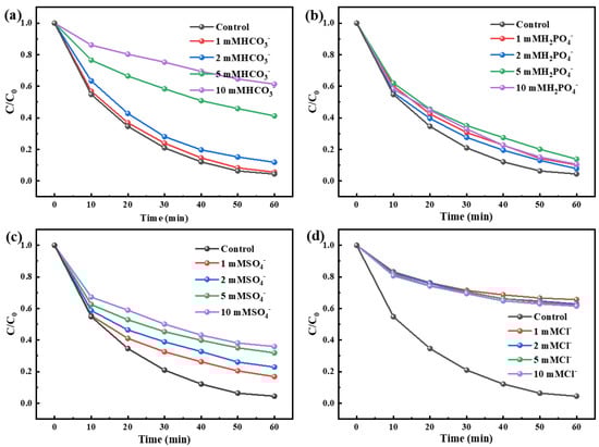 Based on the above reaction conditions, the effects of different concomitant anions were studied, and different concentrations of HCO3−, H2PO4−, SO42−, and Cl− were discussed in the reaction system (Figure 7). The low concentration of bicarbonate ions inhibited the reaction and showed greater inhibition with increasing concentrations. The detection of the pH value and the comparison with the previous pH value influence experiment may be affected by increasing the pH value of water, or the HCO3− may consume the SO4−· and generate HCO3− as Equations (1) and (2) show [,]. With the addition of H2PO4−, it had no obvious inhibition of the degradation process. However, SO42− had a certain degree of inhibitory effect on the reaction system. Combined with relevant studies, it can be explained that the existence of SO42− will inhibit the formation of SO42− by HSO5−, which will indirectly reduce the formation rate of ·OH or ·O2−, as shown in reactions 5 and 7 []. In contrast to the first three, the influence of Cl−was extremely obvious, the inhibition rate was more than 60%, and the kinetic constants were all lower than 0.075 min−1, as shown in Figure S7d. This may be because the PMS concentration in the reaction system was only 0.7 mM, while the concentration of Cl− exceeds 1 mM. Under these conditions, SO42− or HSO5− preferentially react with Cl− to generate Cl· with low oxidation performance, or its ability to degrade organics is poor []. The reaction formulas are shown in Equations (3)–(5) [].