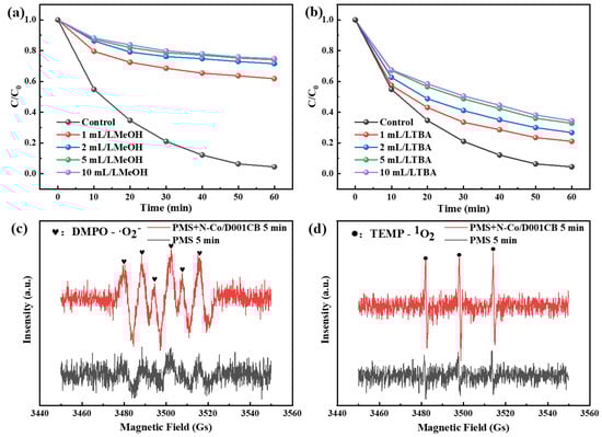 The influence of MeOH (a); and TBA (b) on the catalytic degradation of ibuprofen. EPR test with DMPO or TEMP to detect ·O2− (c); and 1O2 (d) in the reaction system (temperature = 25 °C, pH = 4.5, PMS concentration = 0.7 mM, catalyst added = 0.3 g/L, IBU concentration = 10 mg/L).