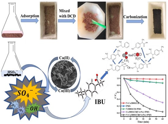 Ibuprofen, as a kind of pharmaceutical and personal care product (PPCP), is widely used and discharged into the environment, and it tends to be persistent, as well as bioaccumulated organic pollutants due to its poor self-decomposition ability, which is doubtless harmful to the ecological environment and human health [,,]. However, PPCPs are hard to separate or degrade by traditional treatment methods and often use advanced oxidation processes (AOPs) instead, such as O3, Fenton, Fenton-like, and photocatalysts [,,]. Among them, activating PMS by heterogeneous catalyst materials to produce sulfate radicals (SO4−·) has a splendid effect on the removal of refractory pollutants [,]. In the process of activating PMS to degrade organic matter, a variety of radical or nonradical active components can be produced, and the contribution degree varies. In radical systems, SO4− · often plays the largest role, while 1O2 is a nonradical function, which regularly depends on completely different activation methods and catalyst materials [,,].