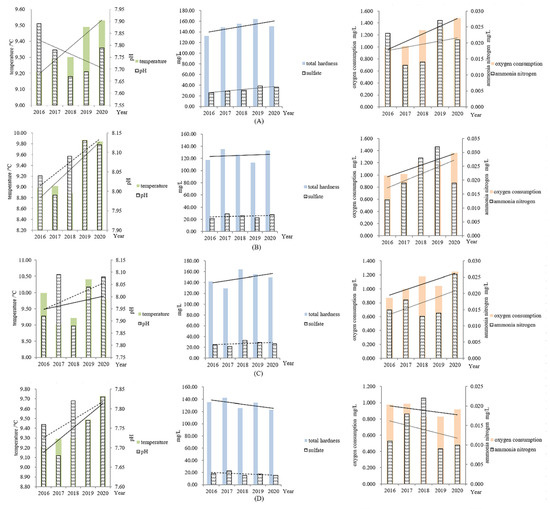 According to Figure 5, the interannual temperature, NH4+-N and CODMn significantly increased. The highest temperature was 9.80 °C in 2019, and the lowest temperature was 9.39 °C in 2016. The maximum NH4+-N content was 0.019 mg/L in 2018, and the minimum value was 0.014 mg/L in 2016. CODMn reached its maximum in 2020. pH had a clear downward trend over the 5 years, of which the smallest value was 8.07 in 2020. The Th and sulfate levels fluctuated overall, but there was no obvious increasing or decreasing trend.