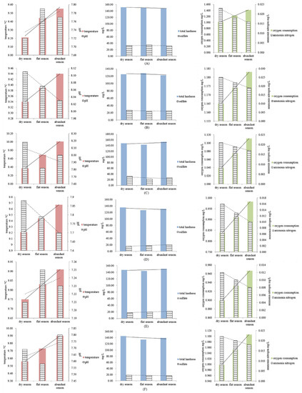 Annual variation of groundwater in the source region of the Yellow River. (A) Temperature and pH. (B) Total hardness and sulfate variation. (C) Ammonia nitrogen and oxygen consumption.