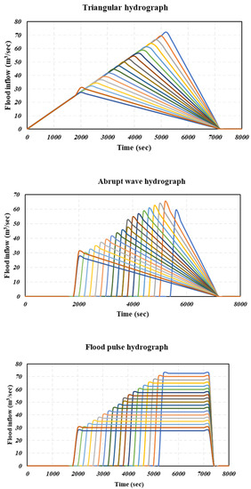 In this study, one hundred inflow hydrographs, 20 of each type, were generated by variations in peak inflows and flood durations to improve the model’s reliability in field conditions (